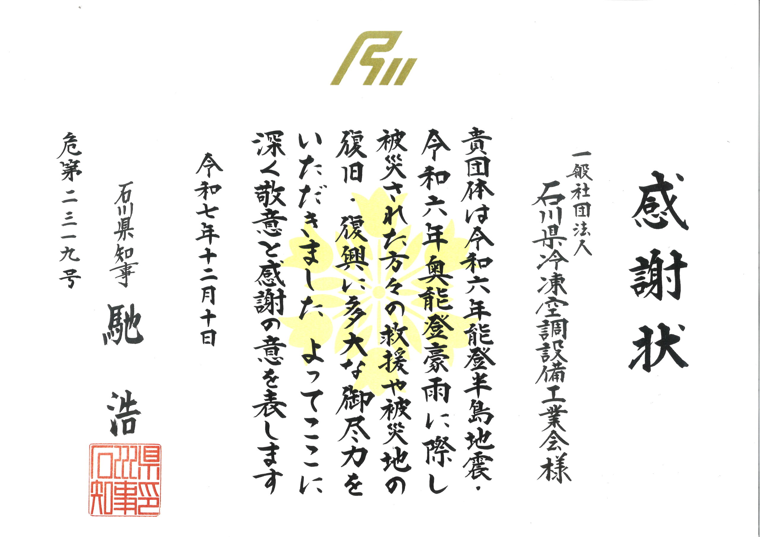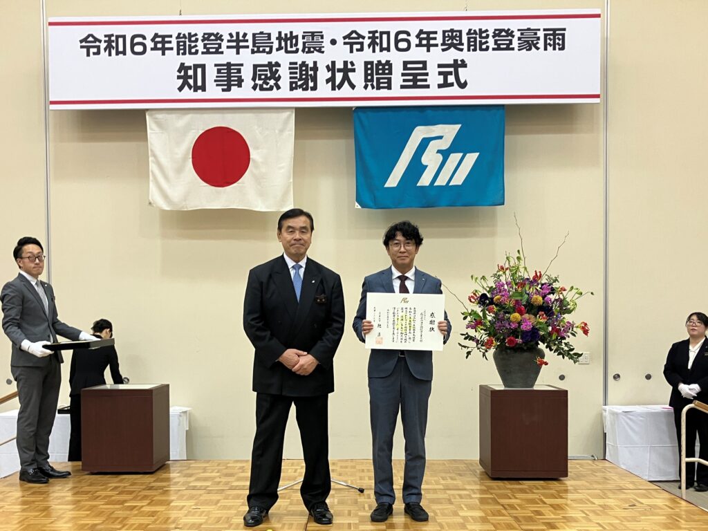 「令和6年能登半島地震・令和6年奥能登豪雨 知事感謝状贈呈式」が下記日程で執り行われ、 当工業会の復旧・復興支援等の取り組みにおいて、石川県より感謝状を拝受いたしました。