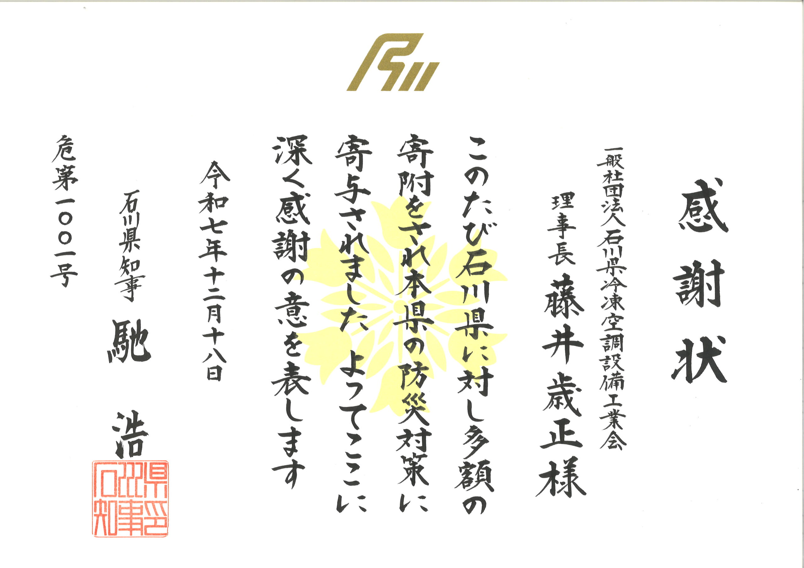 当会は能登の復興のために、石川県危機管理部「耐震化基金」に寄付をさせていただきました。 馳浩知事より今後の対応に使いたい旨お言葉をいただき、感謝状を拝受いたしました。